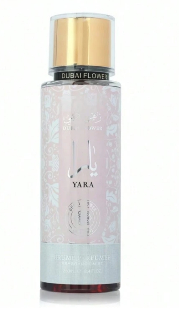 Bruma Yara Rosa de Lattafa: Fragancia femenina dulce y floral con notas de heliotropo, orquídea, mandarina, frutas tropicales, vainilla y sándalo. Ligera y fresca, ideal para cuerpo y cabello.