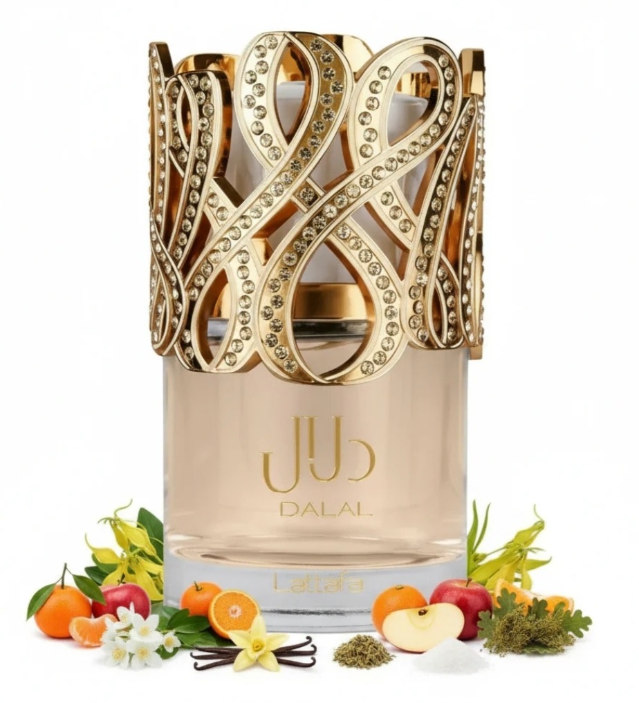 Lattafa Dalal: perfume árabe dulce y floral para mujer, con salida frutal (mandarina, manzana), corazón floral (jazmín, ylang-ylang) y fondo cálido de vainilla y almizcle 🌸✨.