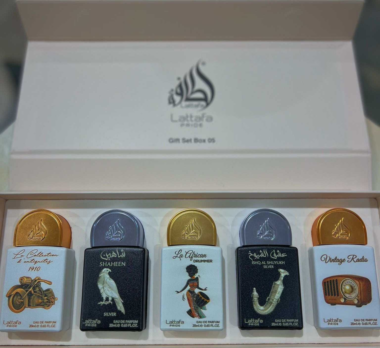 Se tarta de un Pack de Lattafa Pride que contiene 5 frascos de 20 ml cada uno de ellos. La Collection D´Atiques 1910, Shaheen Silver, La African Drummer, ,  Isha Al Shuyuck Silver y Vintage Radio